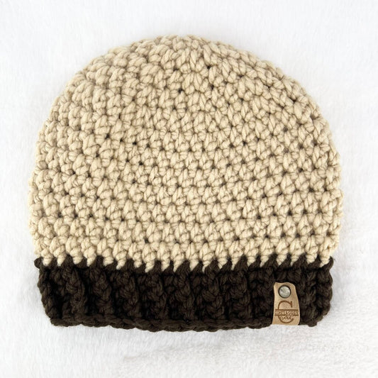 Comfy & Cozy CrochetBeanie Hat (Adult) - Sand with Chocolate Brim