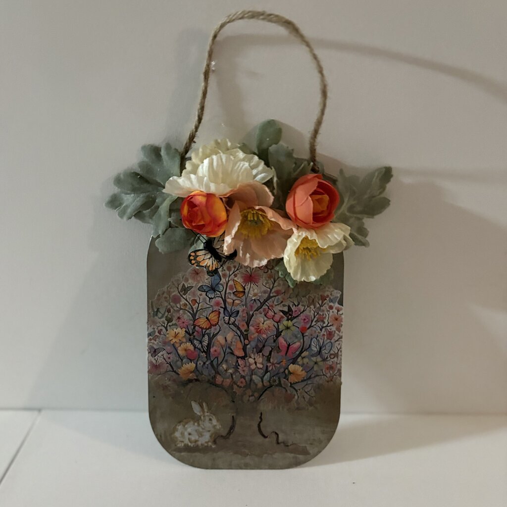 Metal mason jar shape hanger. Beautiful, peaceful butterfly tree with flower arrangement on top.