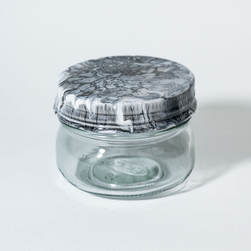Hand-Painted Fluid Art 4 oz Glass Jar This 4 oz glass jar features an original fluid art design on the lid, finished with a glossy resin coat for depth and shine. Ideal for jewelry, crystals, or small keepsakes. Each piece is one of a kind.