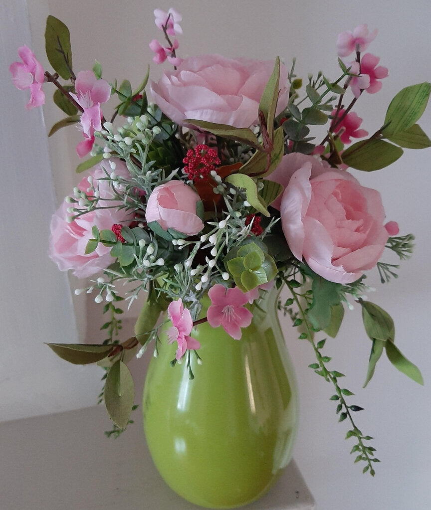 lime green vase with a variety of pink florals