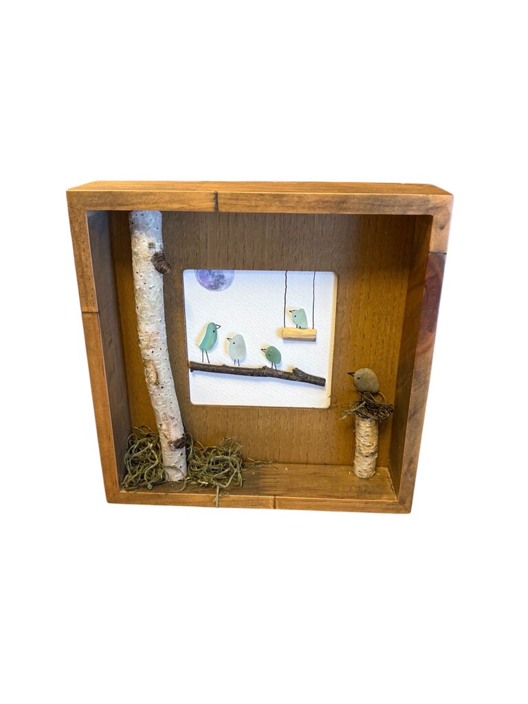 5 sea glass birds in open frame, 1 on swing