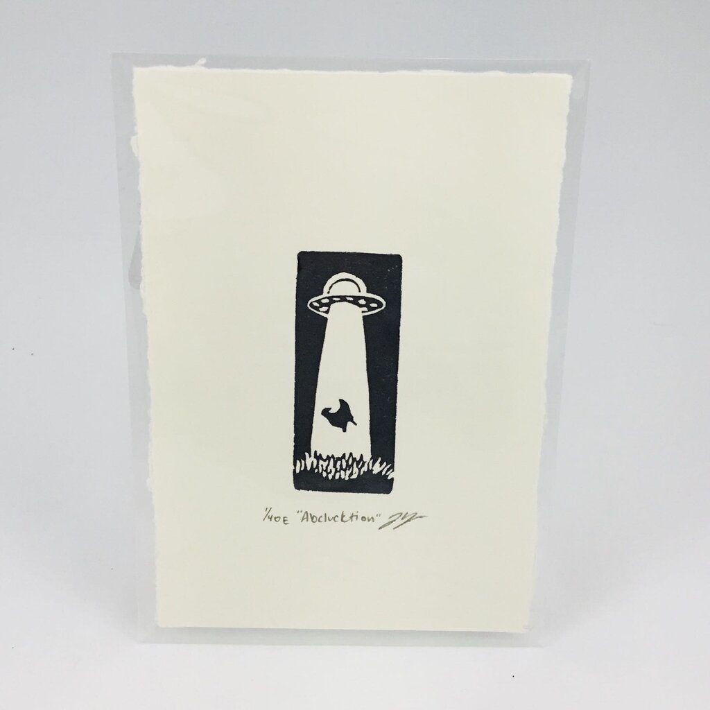This is a miniature relief print, made by carving and stamping an eraser! Depicts a chicken being abducted by aliens....