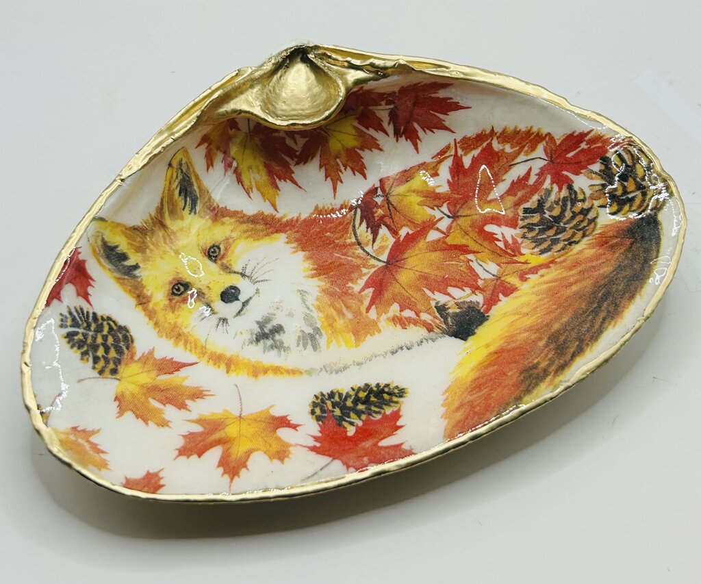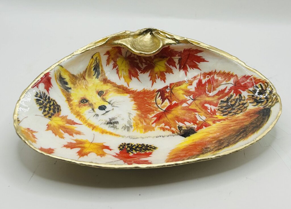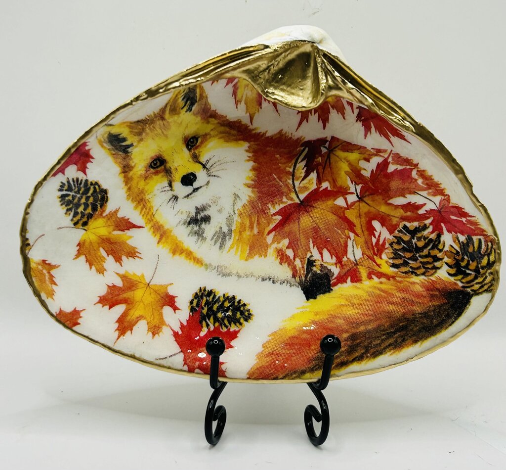 Hand decoupaged XXL Clam from Acadia, Canada. An elegant gold trim adorns this adorable Autumn Fox seashell. The back of...