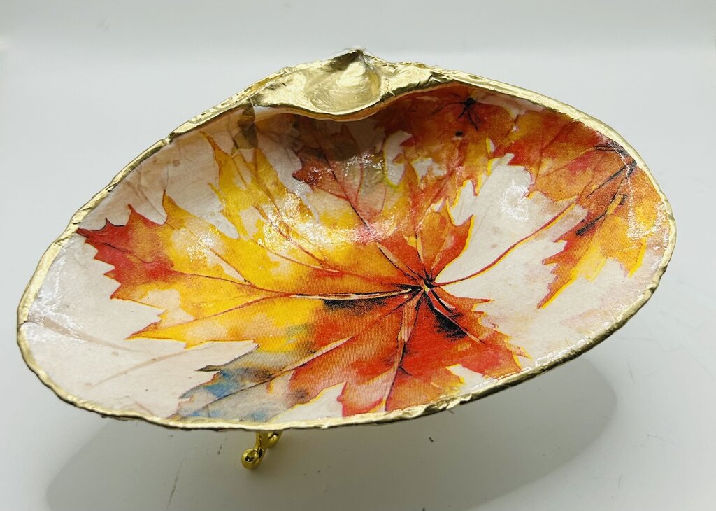 Hand collected and decoupaged XL Clam from Newport, RI. An elegant gold trim adorns this fall leaf seashell. The back...