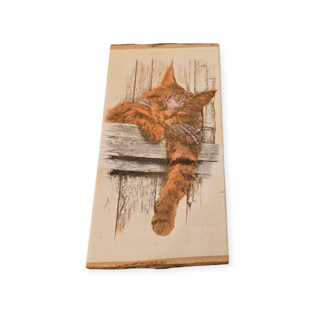 Engraved into the wood and handpainted. Sawtooth hanger on the back