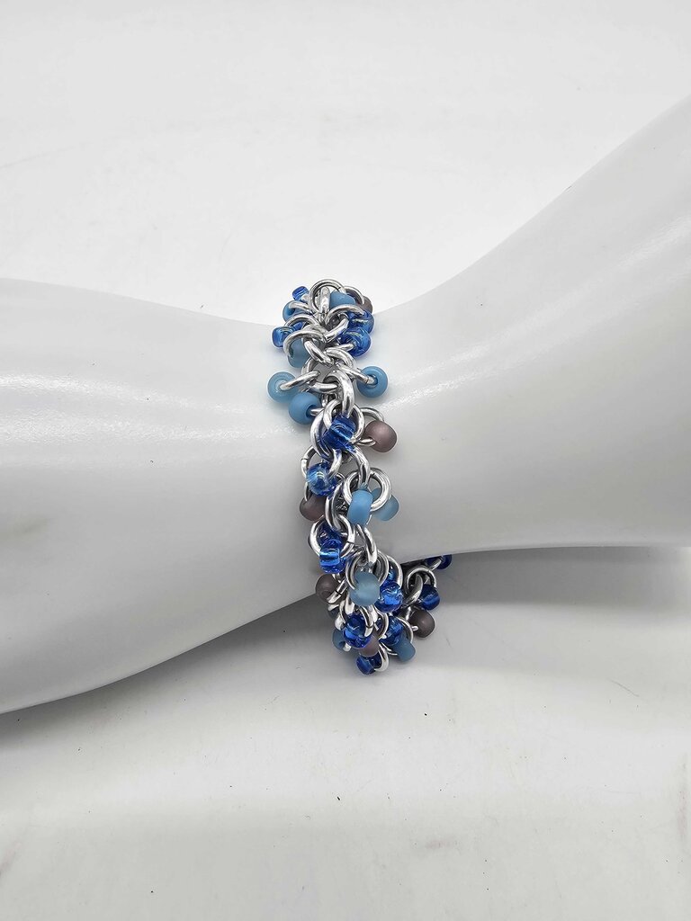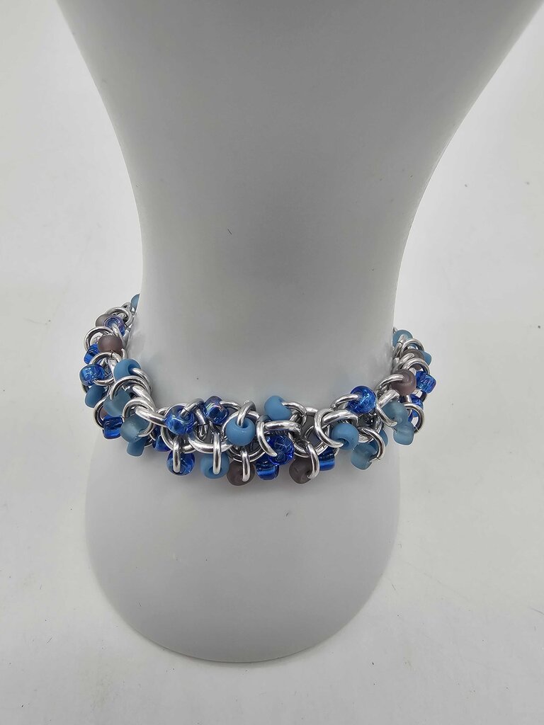 mix of dark and light blue beads on shaggy loop silver aluminum bracelet