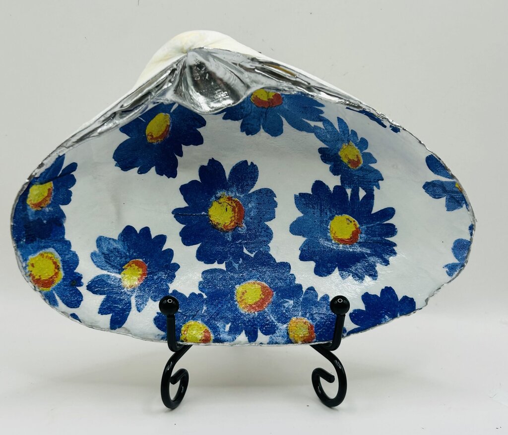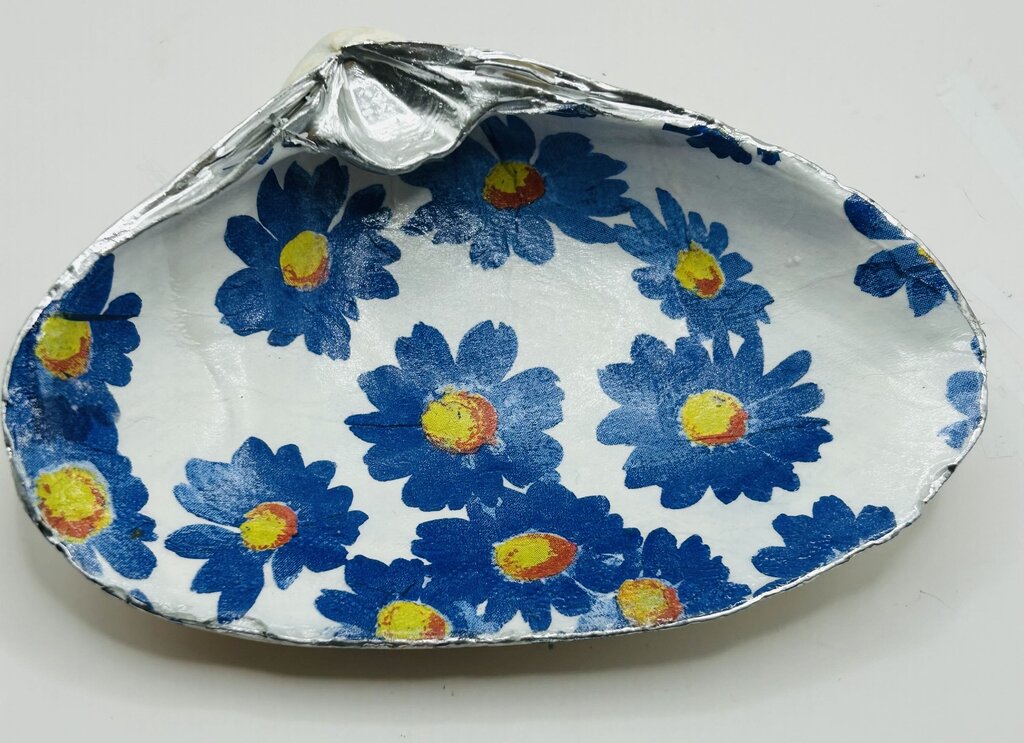Hand collected and decoupaged Clam from Newport RI. Decorated with bright blue flowers. Measures 5.5" X 3.75"