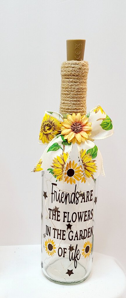 Upcycled wine bottle- "Friends are the flowers in the garden of life". Includes fairy lights and replacement batteries. Ribbon, embellishment...