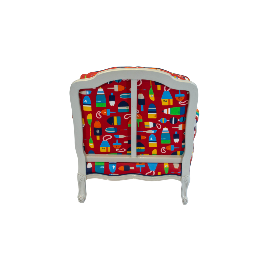One-of-a-Kind newly upholstered Berger chair & matching ottoman upholstered in Red Sunbrella Buoy printed fabric with Navy Sunbrella contracting welting...