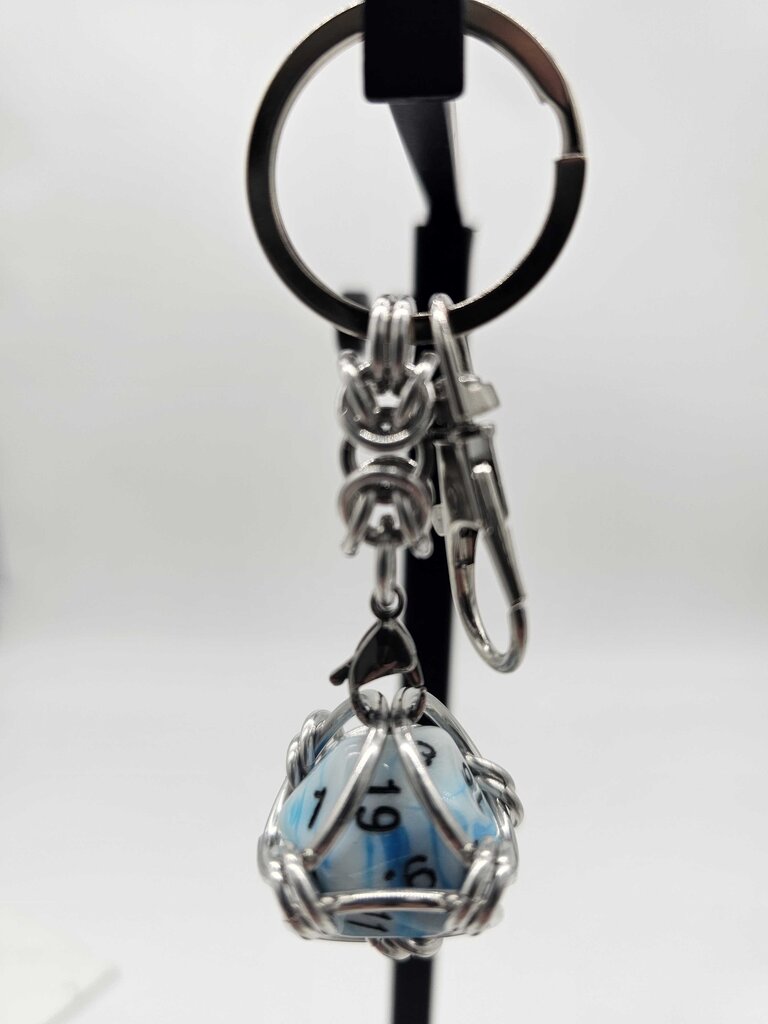 Caged D20 Keychain - Dark Blue White Marble D20, Silver Byzantine