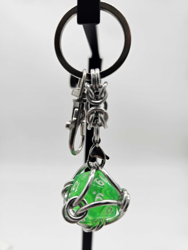 Caged D20 Keychain - Translucent Bright Green D20, Silver Byzantine