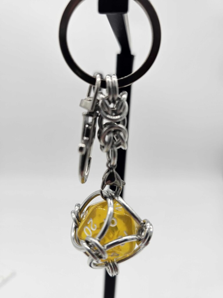 Caged D20 Keychain - Translucent Yellow D20, Silver Byzantine