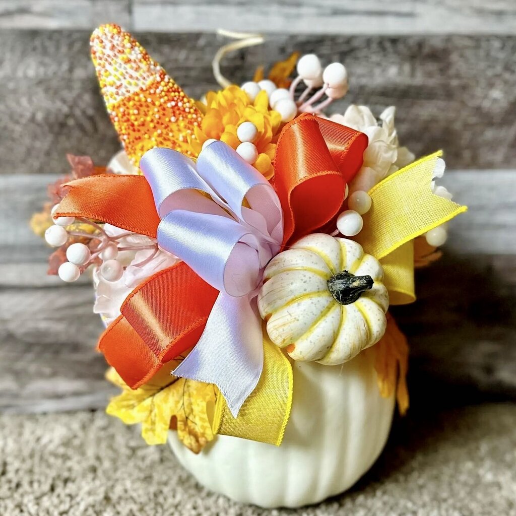 Candy Corn Pumpkin Centerpiece, Whimsical Fall Arrangement with Autumn Leaves & Florals, Thanksgiving Table Decor, Office Decoration