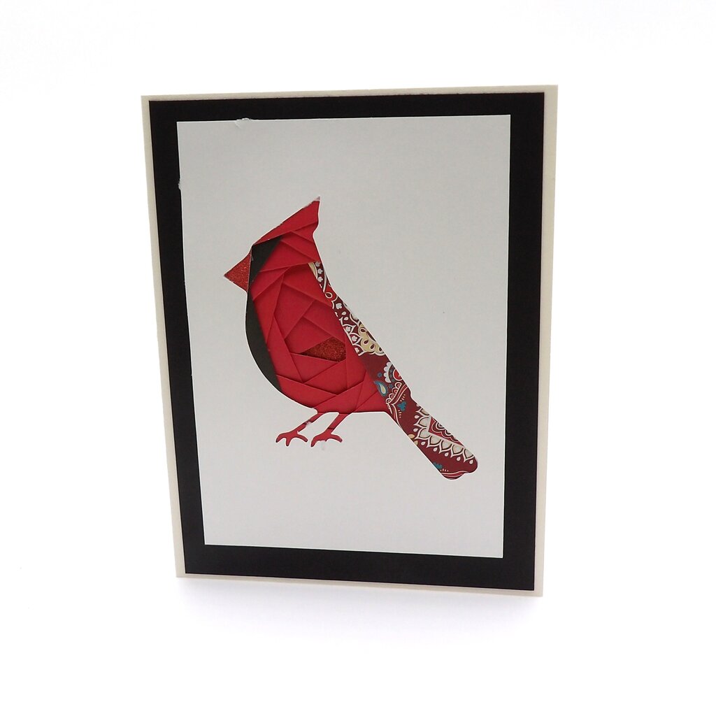 Black accent with a red beak and red solid origami papers. Blank inside for your personal message. Card base is made with FSC-certified, 100% recycled PCW,100lb cover cardstock. Includes a coordinating A2 envelope and a commercially compostable protective sleeve.
