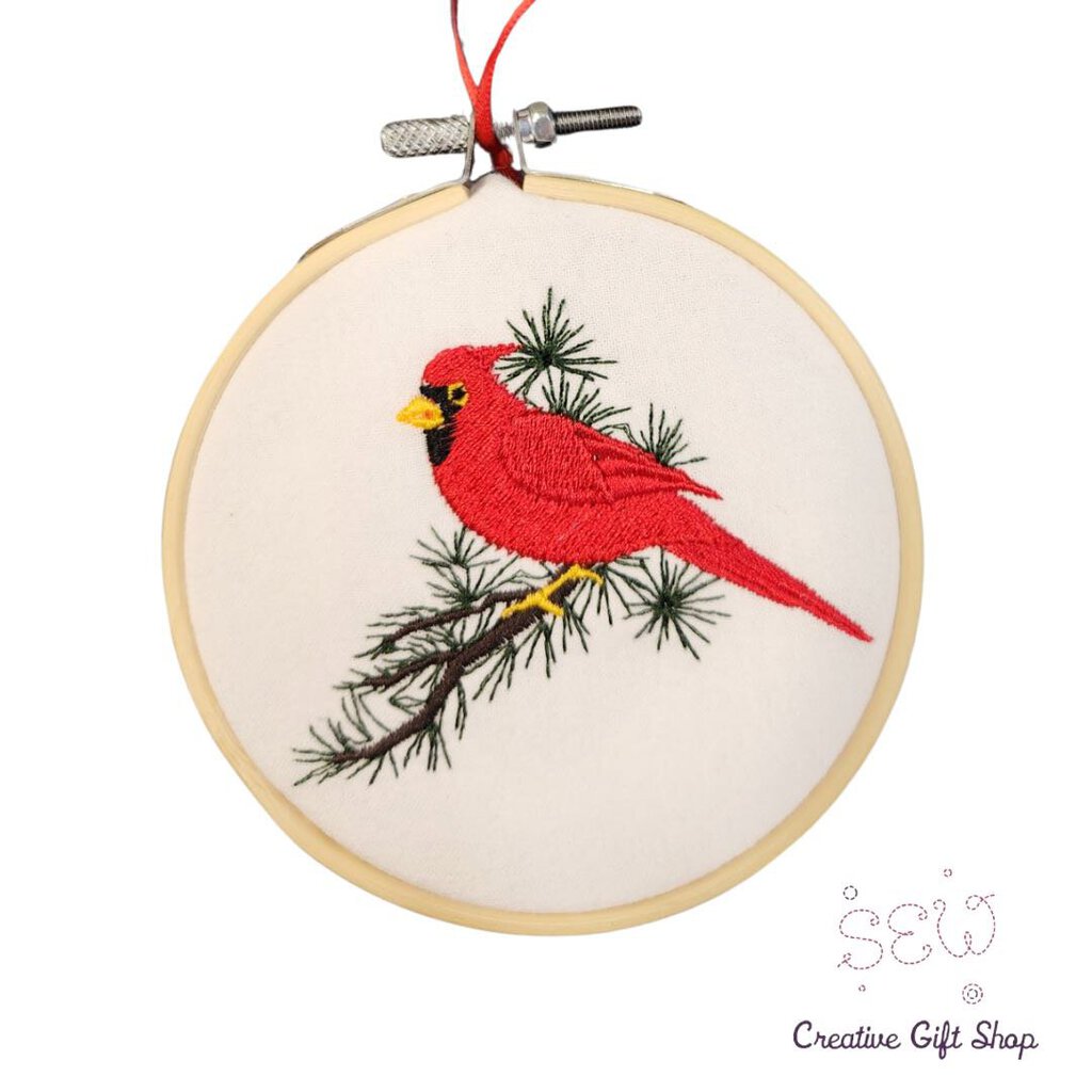 4" Hooped Ornament with Embroidered Cardinal on Branch – a delicate and timeless addition to your holiday décor. Nestled within a charming wooden hoop, this ornament captures the beauty of winter with an intricately embroidered cardinal perched upon a delicate branch. Not just a holiday decoration, this hooped ornament with an embroidered cardinal is a delightful gift for bird enthusiasts or anyone who appreciates the grace of nature. Hang it with pride, and let the cardinal's presence bring a sense of joy and elegance to your seasonal celebrations.