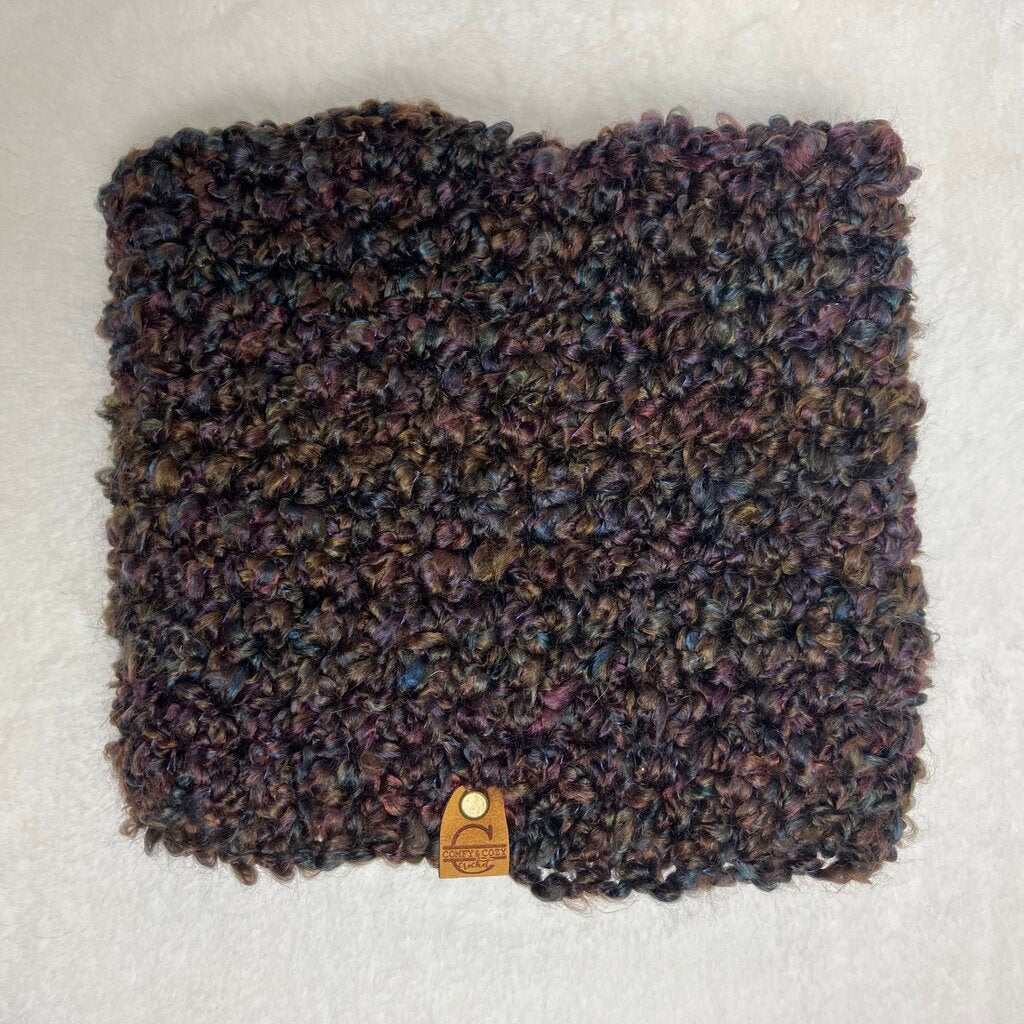 Crochet infinity scart. Made with acrylic yarn. Machine wash gentle. Lay flat or tumble dry low heat.