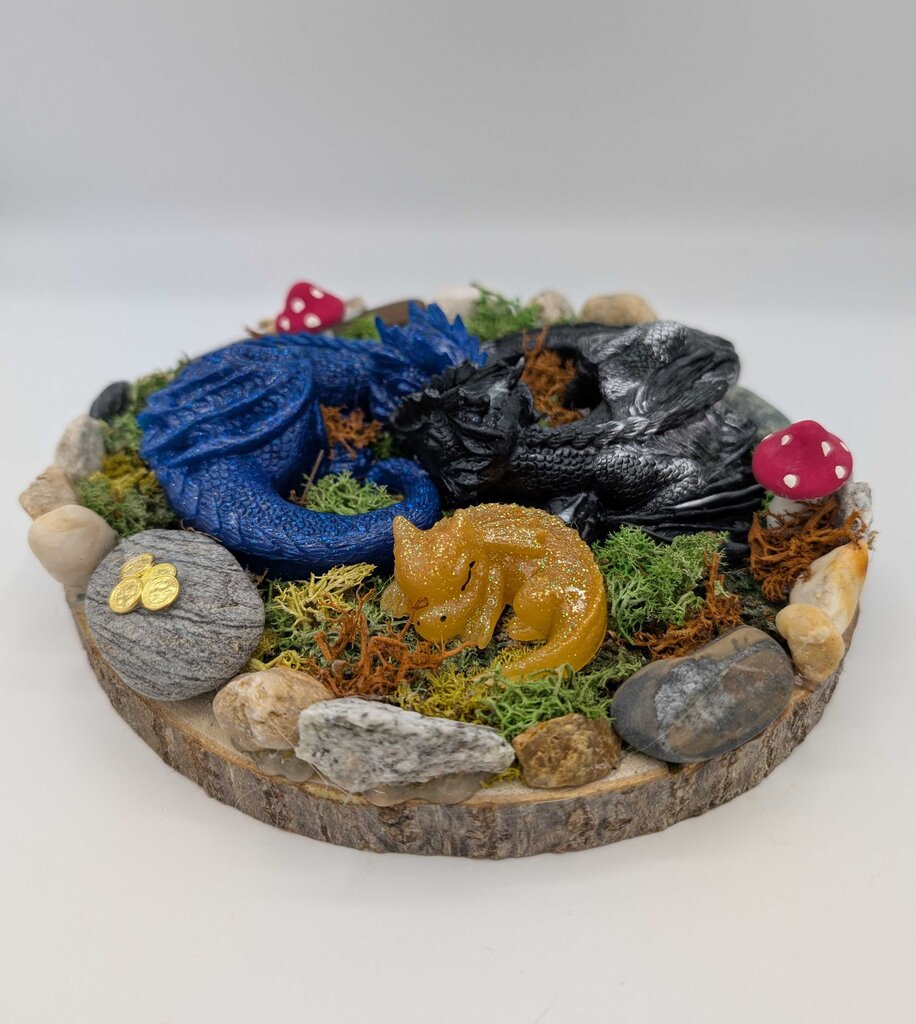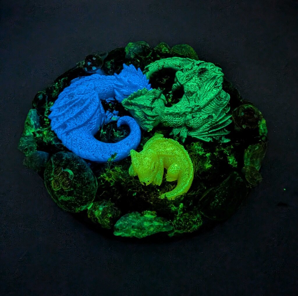 Two glow in the dark sleeping dragons and one baby sleeping dragon.