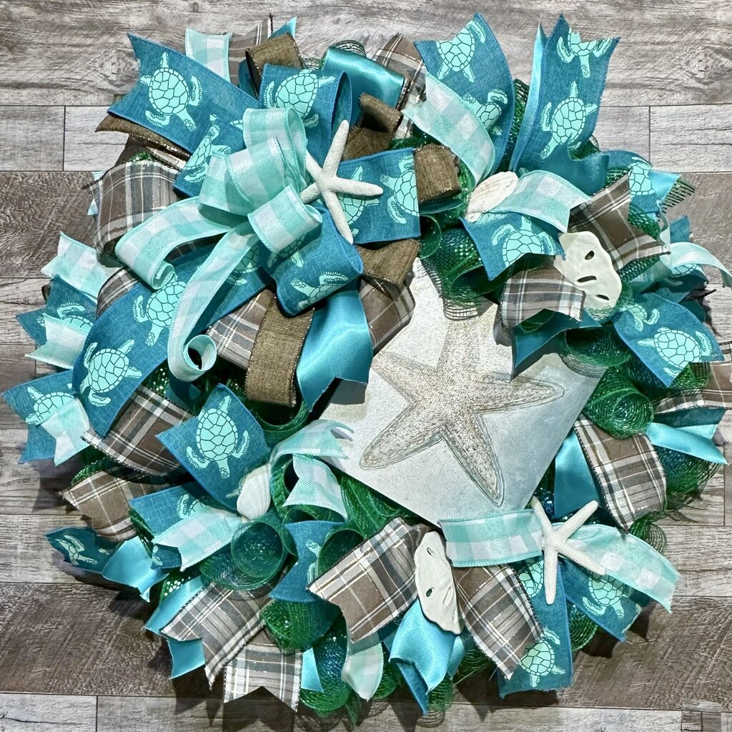 Coastal Front Door Wreath with Brown Starfish and Turtle, Teal Blue Deco Mesh Wreath, Nautical Beach House Door Decor, Beachy Starfish Decor