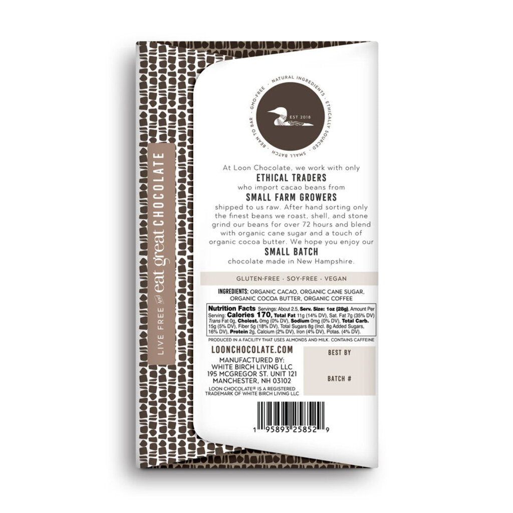 70% dark chocolate made from a blend of premium cacao beans from around the globe with NH roasted coffee. Makes a perfect mid-morning treat!