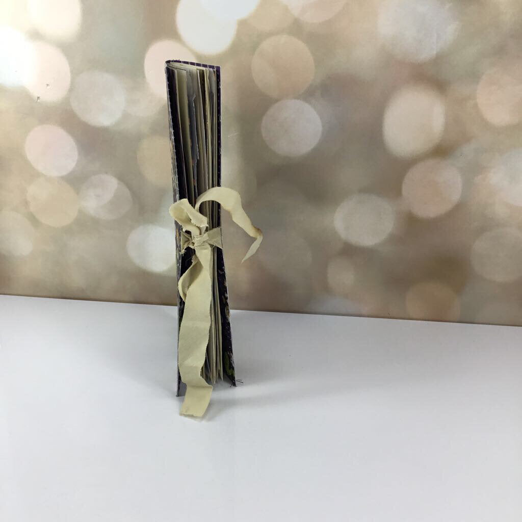 8.5"H x 4.5" W with 56 pages, sewed cardstock cover with attached closure and fabric trim on the spine. Halloween...