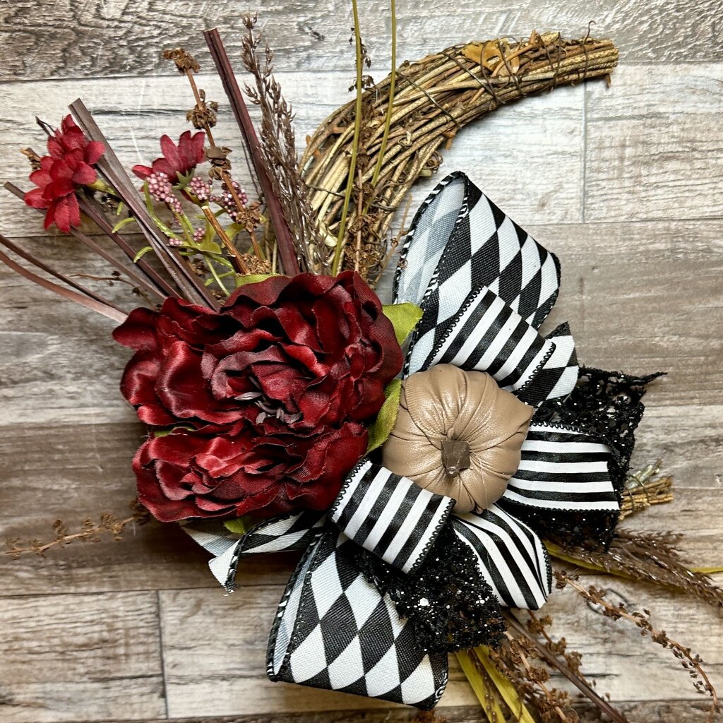 Crescent Moon Fall Halloween Wreath with Pumpkin & Black and White Ribbon Whimsy Wreath Design Co Share Deel Messenger Email Low Stock Crescent Moon Fall Halloween Wreath with Pumpkin & Black and White Ribbon Whimsy Wreath Design Co Share Deel Messenger Email Product form This item is only available for in-store pickup. HALLOWEEN DECOR Free pickup in store! Free pickup in store! Size On 8 inch crescent moon grapevine, this meaures 11 inches tall and wide from tip to tip. ColorBlack, White, Dark Red Condition New $18.00 Quantity Add to cart