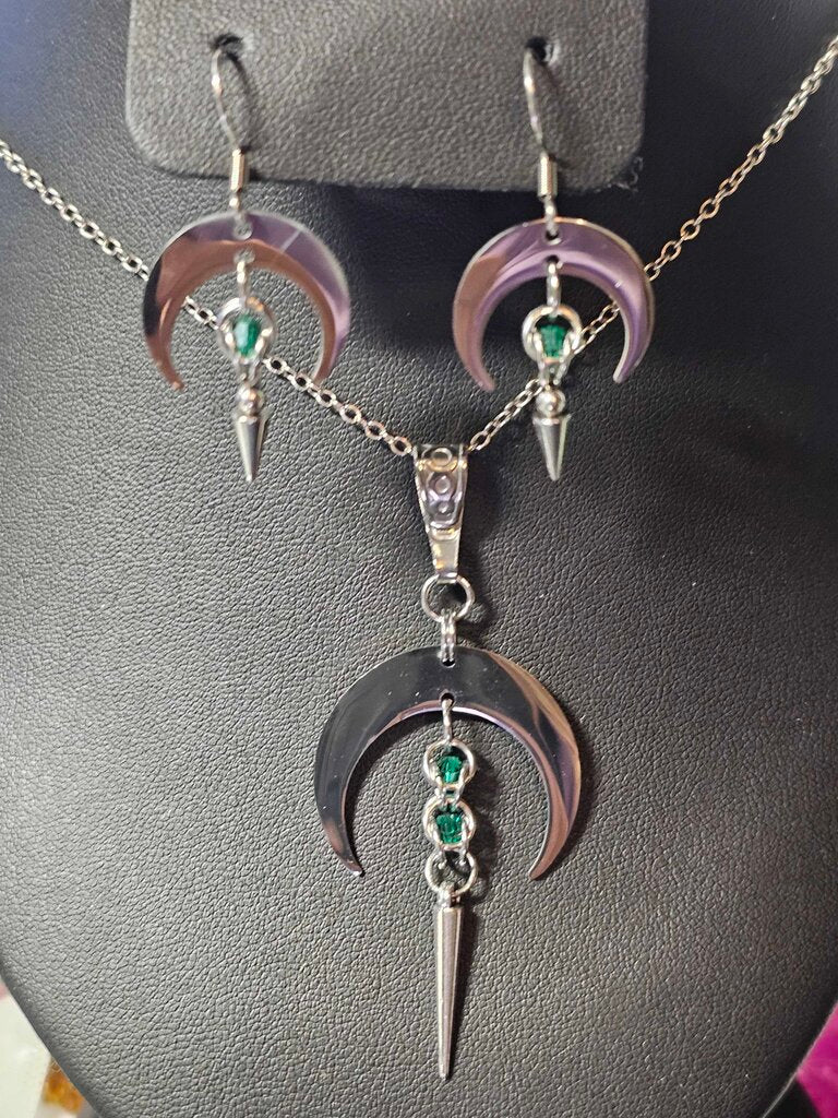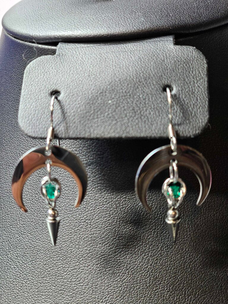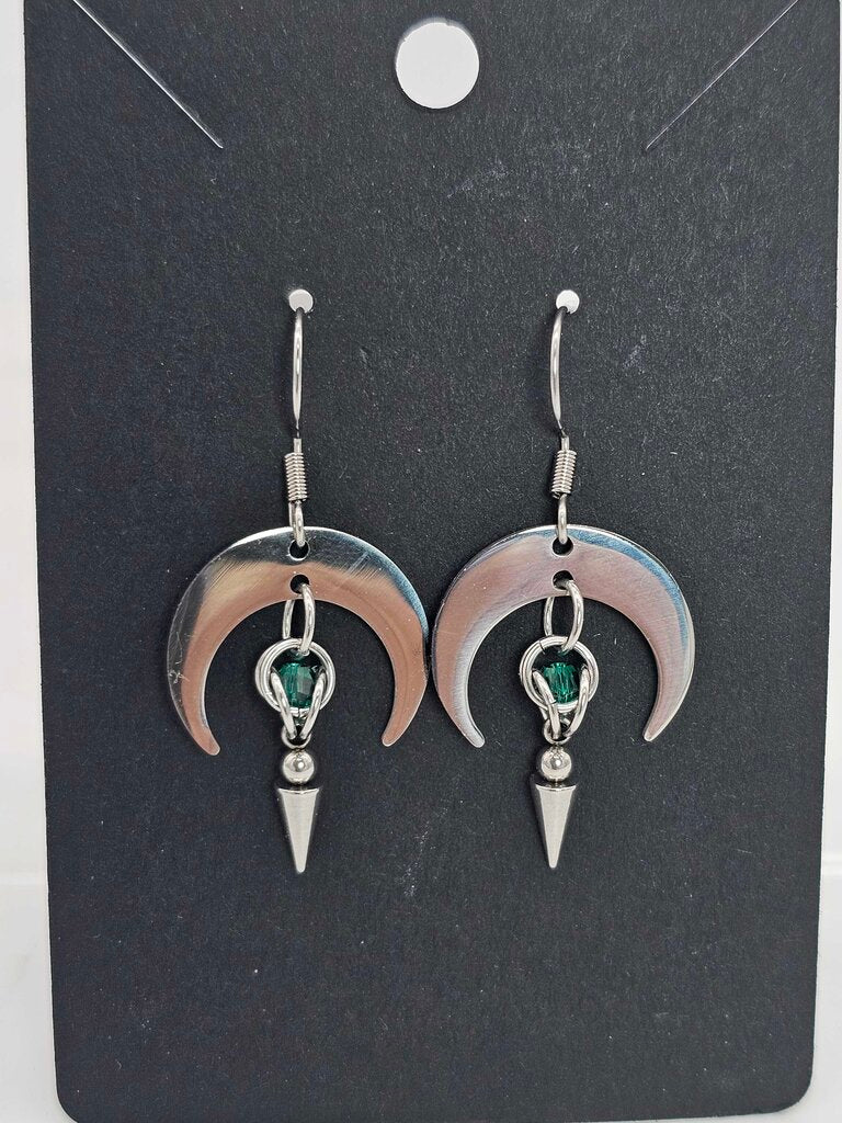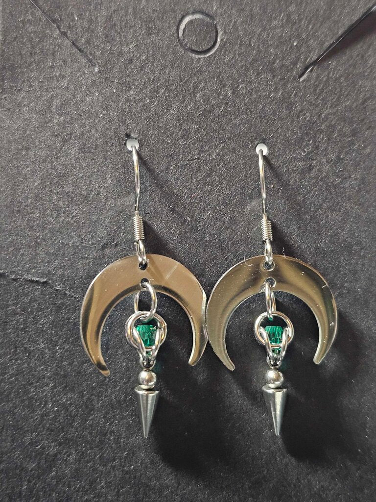 Crescent Moon with Green Captured bead and Spike Stainless Steel Earrings Gray Cat Manor Designs Share Deel Messenger Email Low Stock Crescent Moon with Green Captured bead and Spike Stainless Steel Earrings Gray Cat Manor Designs Share Deel Messenger Email Product form This item is only available for in-store pickup. EARRINGS Free pickup in store! Free pickup in store! Size 1 inch by 1 inch Colorsilver, green Condition New $25.00 Quantity Add to cart