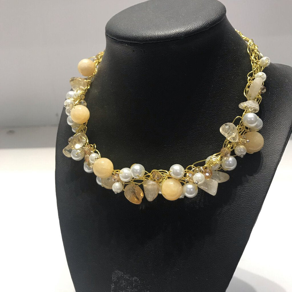 Gemstone necklace yellow agate, citrine and crystal pearl crochet necklace. Made with non tarnish silver wire and stainless steel findings.