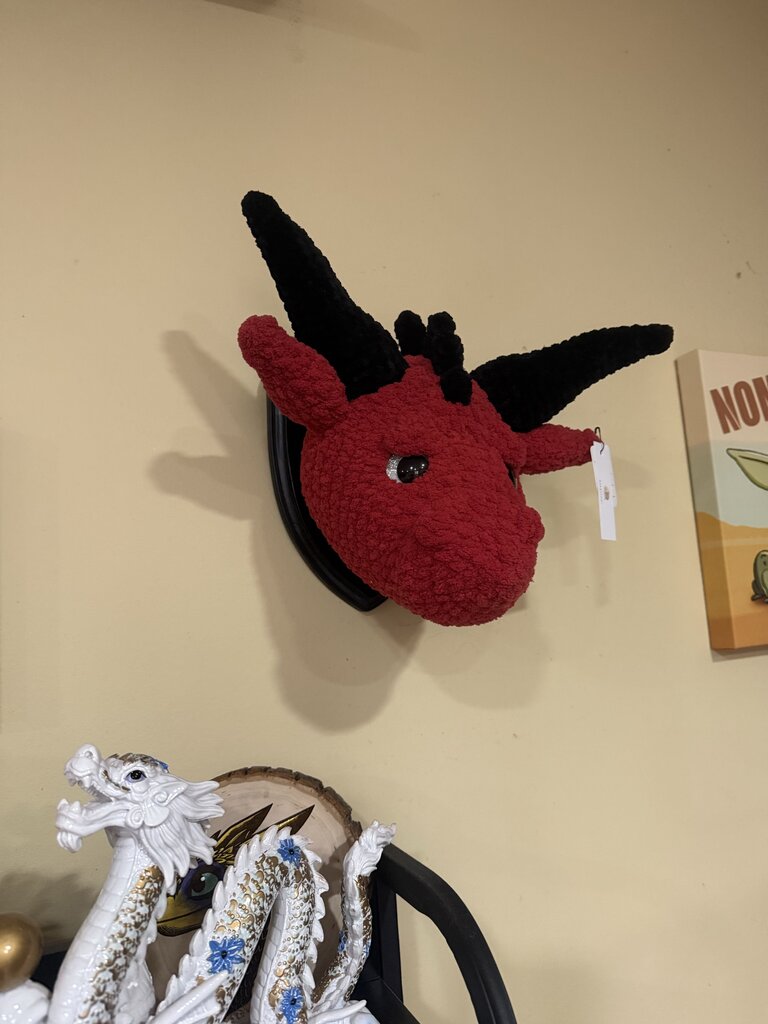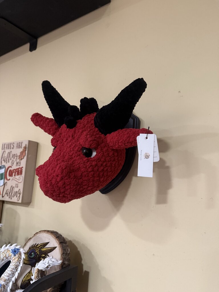Crocheted dragon head plaque Raegurumi Share Deel Messenger Email Low Stock Crocheted dragon head plaque Raegurumi Share Deel Messenger Email Product form This item is only available for in-store pickup. CROCHET STUFFIES - Stuffed Animals Crocheted dragon head mounted on a shield shaped plaque with hardware to be hung on a wall Free pickup in store! Free pickup in store! Size Large ColorRed/black Condition New $72.00 Quantity Add to cart