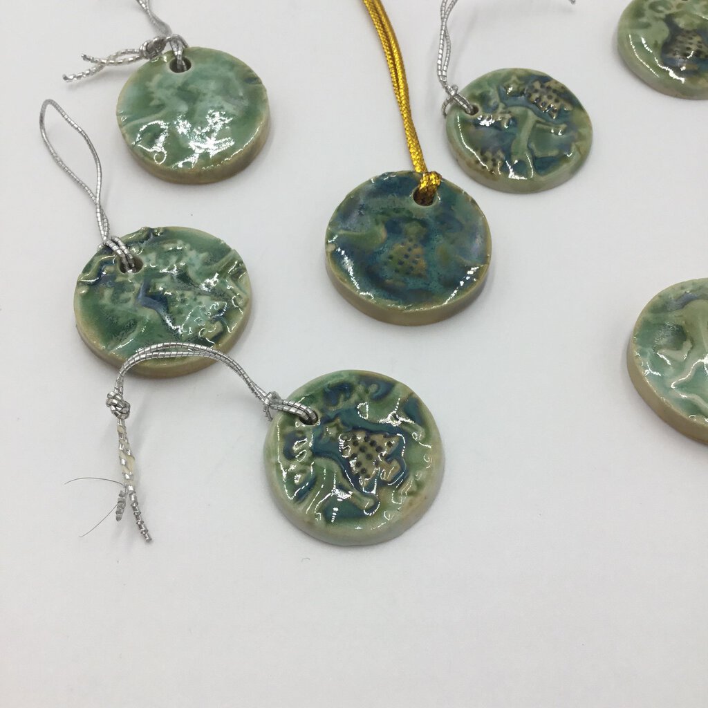 small ceramic ornaments shaped like massachussetts and colored to look like the beach