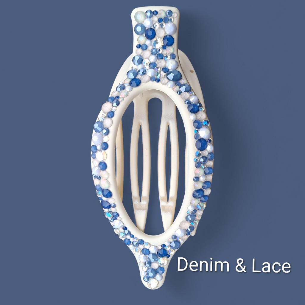 Lay Flat Hair Claw Clips are an upgraded twist on the traditional claw clip. These are curved to lay flat against your head. This is more comfortable, as it doesn't dig in or lay funny when sitting against something. Each clip has been decorated with glass rhinestones for an elevated, fun, and fancy look. Measures 4.7 in long and 2 inches tall. Great for many hair types.
