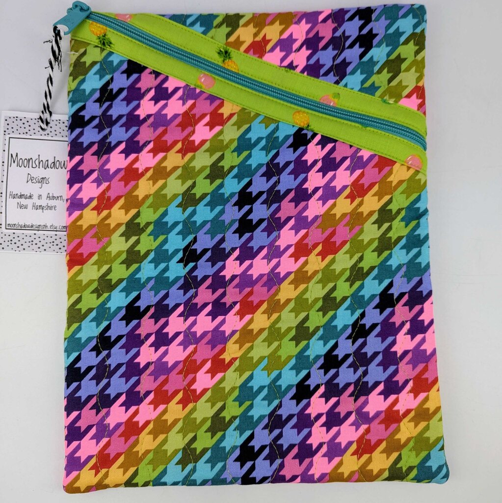 Quilted diagonal zipper pouch, measures approx 11.5"x9". Perfect for a tablet or hardcover book.