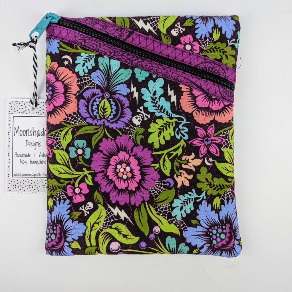 Quilted diagonal zipper pouch, measures approx 9"x7". Perfect for a small e-reader or paperback book.