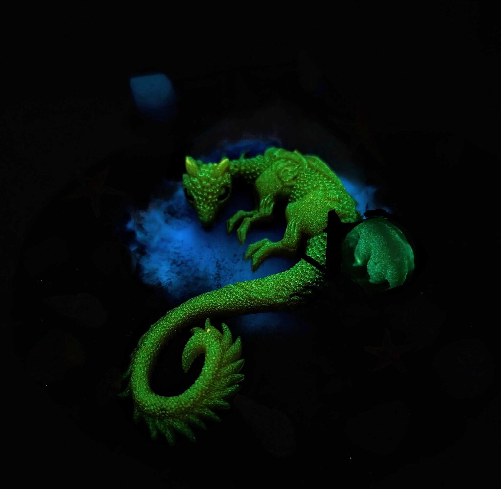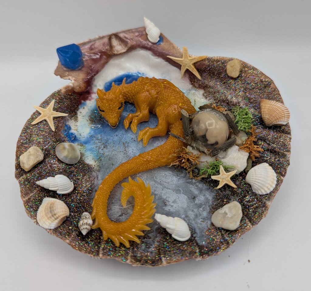 large REAL seashell containing a glow in the dark mermaid dragon and egg with "water" that glows