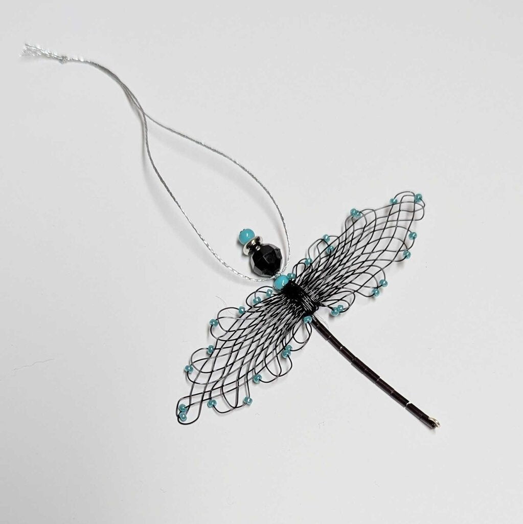 Eye catching dragonfly ornament will look good anywhere! Wings woven with wire and beads on a pin loom, then attached...