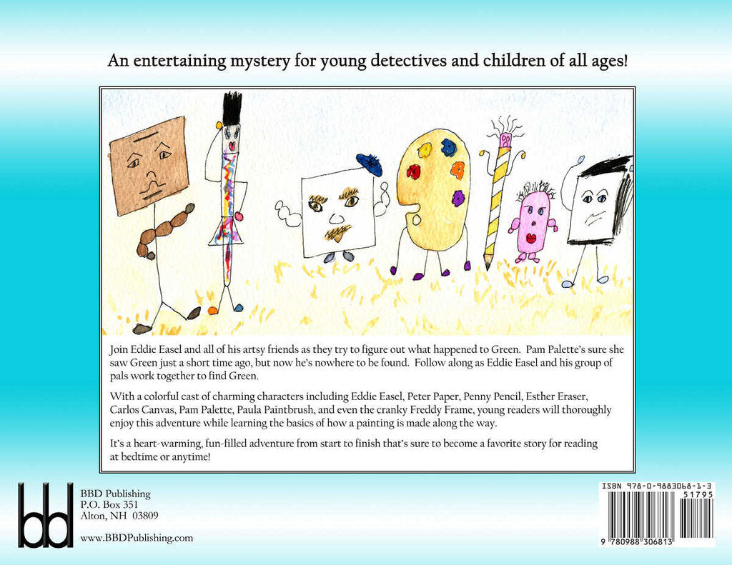 Your child will have fun joining this joyfully drawn group of characters, Eddie Easel, Paula Paintbrush, Pam Palette, Carlos Canvas, and all their friends, as they search high and low, indoors and outdoors, looking for the missing Green. Can you help this delightful and unique art group solve the mystery? Each child will also learn a little about painting along the way, too!