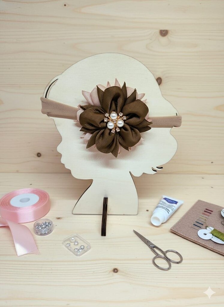 Crafted with love and attention to detail, this beautiful headband features a stunning multi-layered flower in rich brown and soft blush tones. The center of the flower is delicately embellished with lustrous faux pearls and sparkling rhinestones, creating a captivating focal point. The flower is securely attached to a comfortable, stretchy nude/blush colored elastic headband, designed to be gentle on delicate skin and hair.