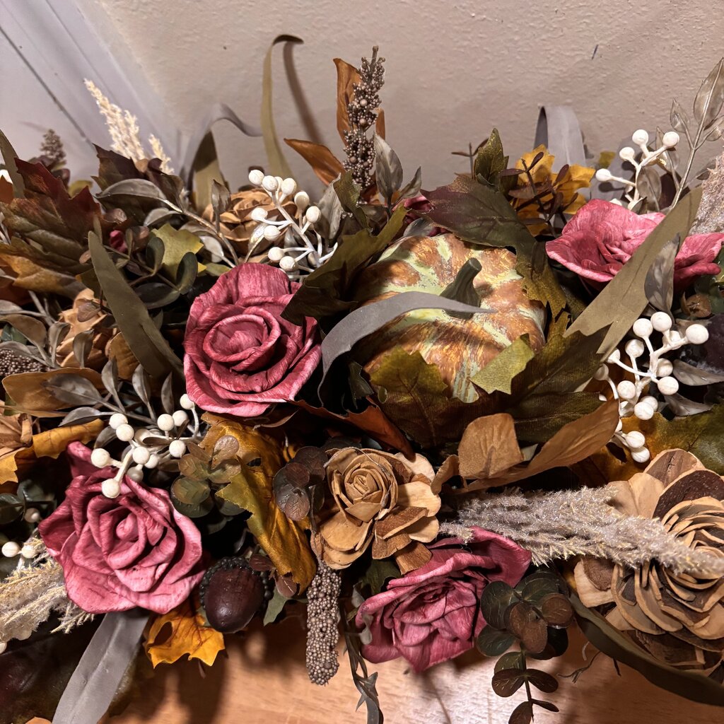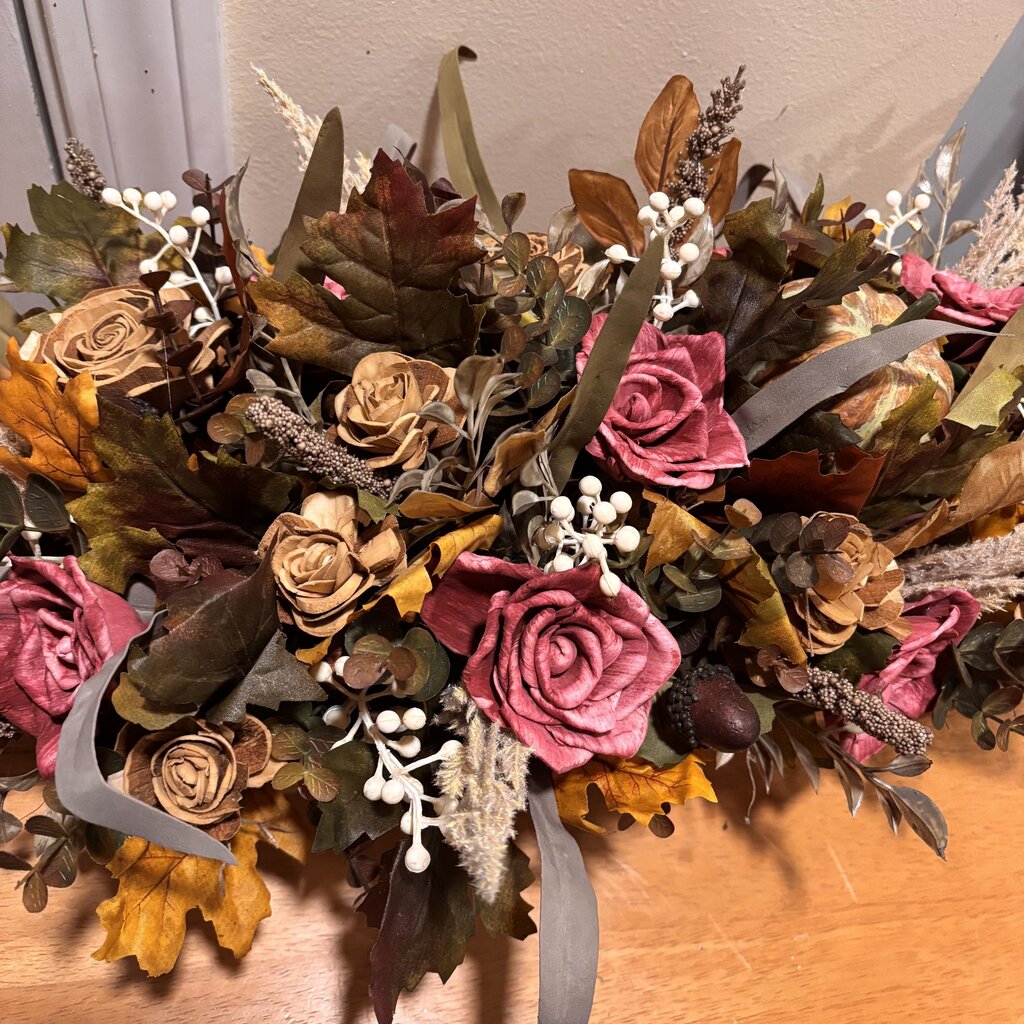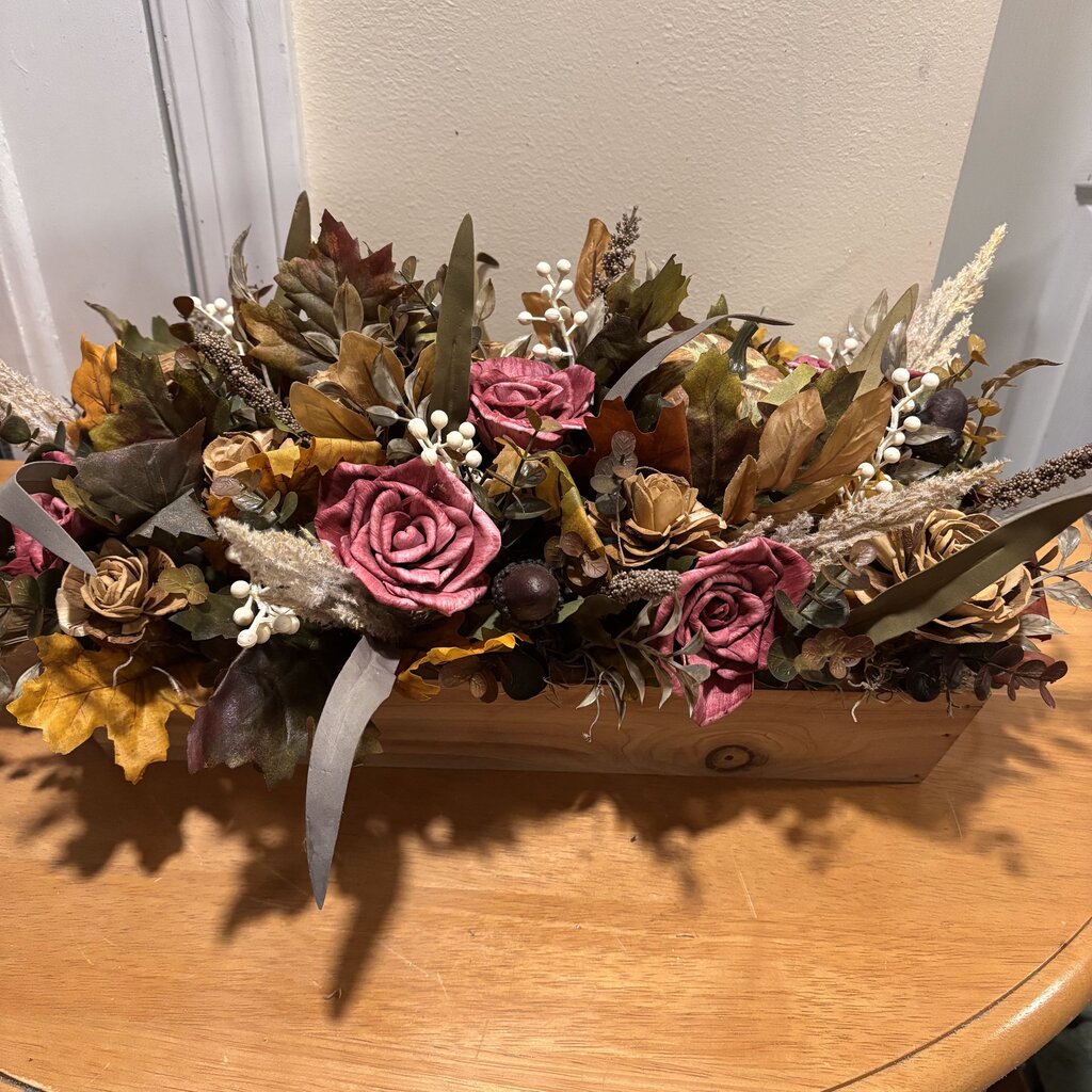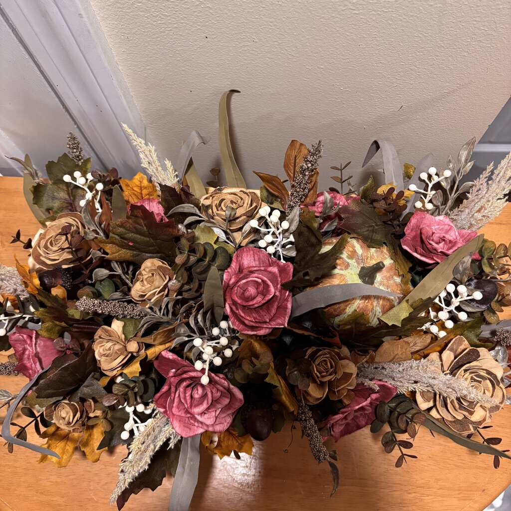 Fall Arrangement with Pumpkin and Sola Wood Flowers in wooden box