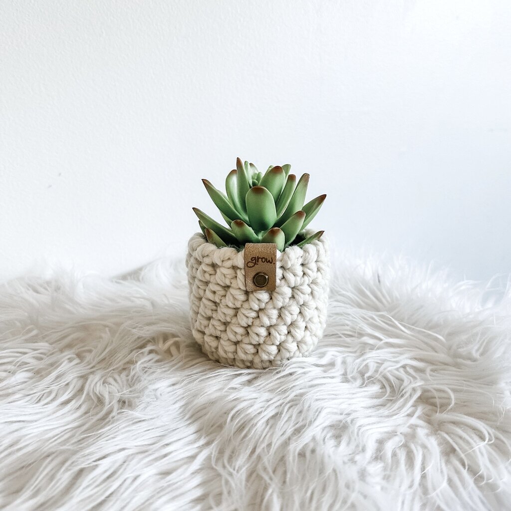Faux Potted Succulent in Crochet Plant Cozy Script GROW Tag (Style E)