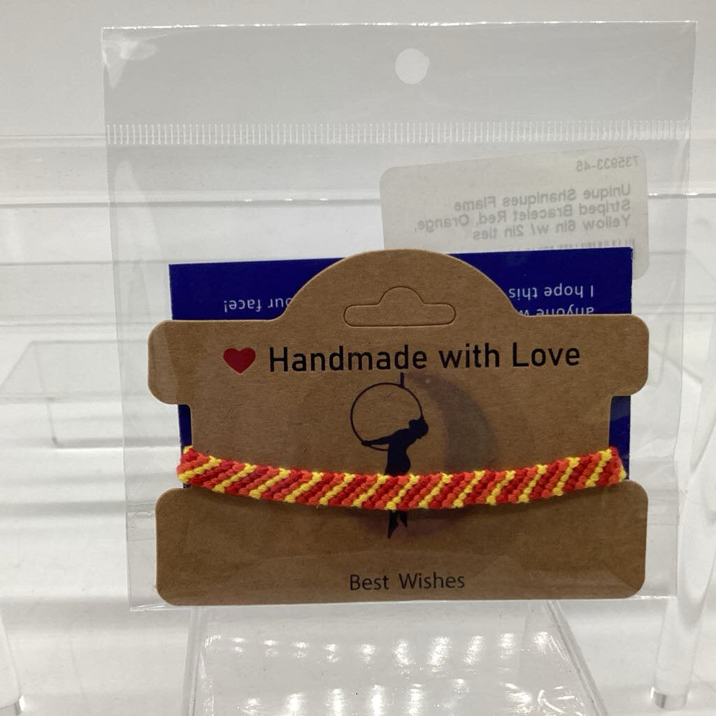 Flame Striped Bracelet Unique Shaniques Share Deel Messenger Email Flame Striped Bracelet Unique Shaniques Share Deel Messenger Email Product form This item is only available for in-store pickup. BRACELETS Single striped friendship bracelet Free pickup in store! Free pickup in store! Size 6in w/ 2in ties ColorRed, Orange, Yellow Condition New $4.00 Quantity Add to cart