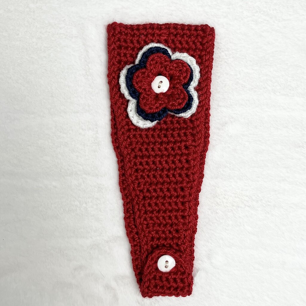Crochet winter headband/ear warmer made with acrylic yarn. Machine wash gentle. Lay flat or tumble dry low heat.
