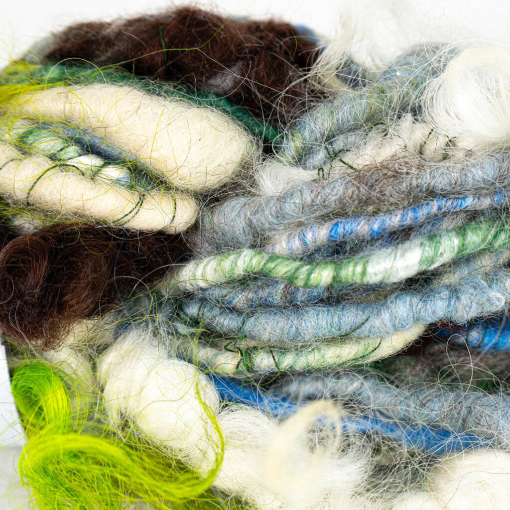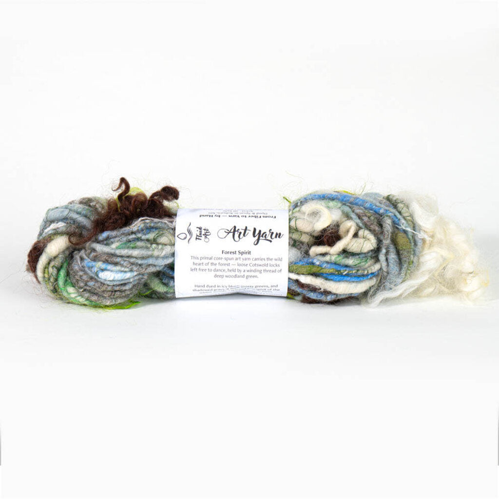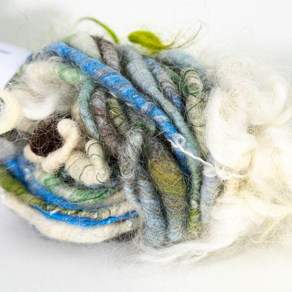 This primal core-spun art yarn carries the wild heart of the forest - loose Cotswold locks left free to dance, held by a winding thread of deep woodland green. Hand dyed in icy blues, mossy greens, and shadowed grays, it feels like the spirit of the winter woods, captured in fiber form. Fiber: Merino ? Tussah Silk ? Gotland ? Falkland ? Angelina ? Cotswold 9 yards of untamed beauty Super bulky ? Core spun 80 g of fiber treasure