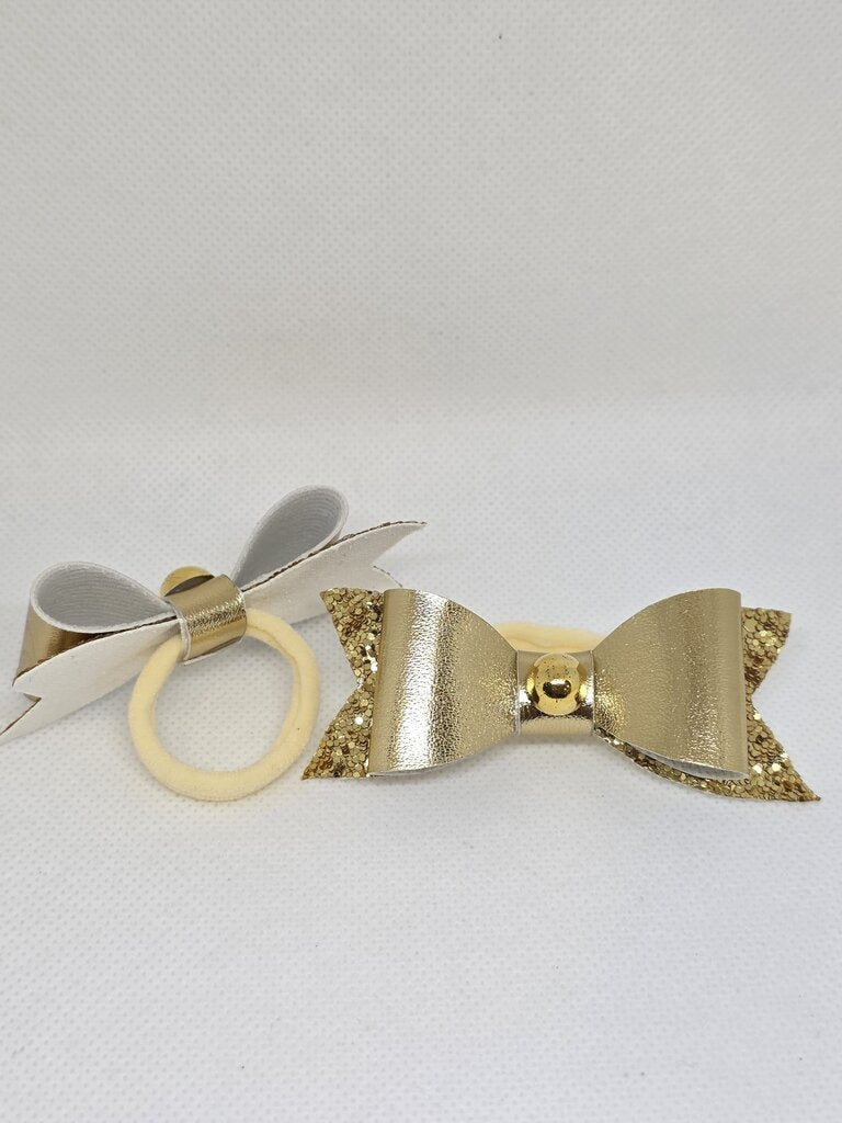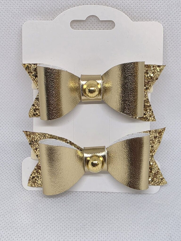 A chic set of two mini hair bows crafted in metallic gold tones. One features a smooth gold faux-leather finish,...