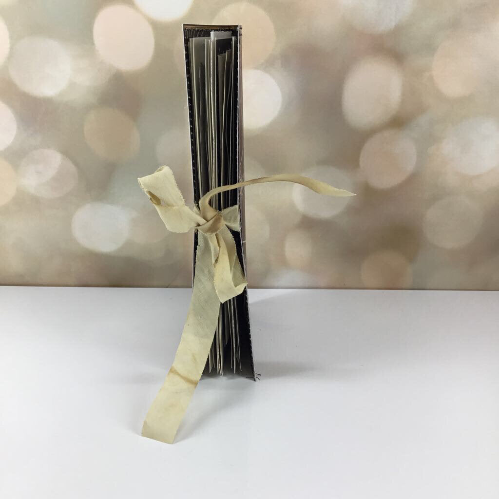 8.5"H x 4.5" W with 56 pages, sewed cardstock cover with attached closure and fabric trim on the spine. Halloween...