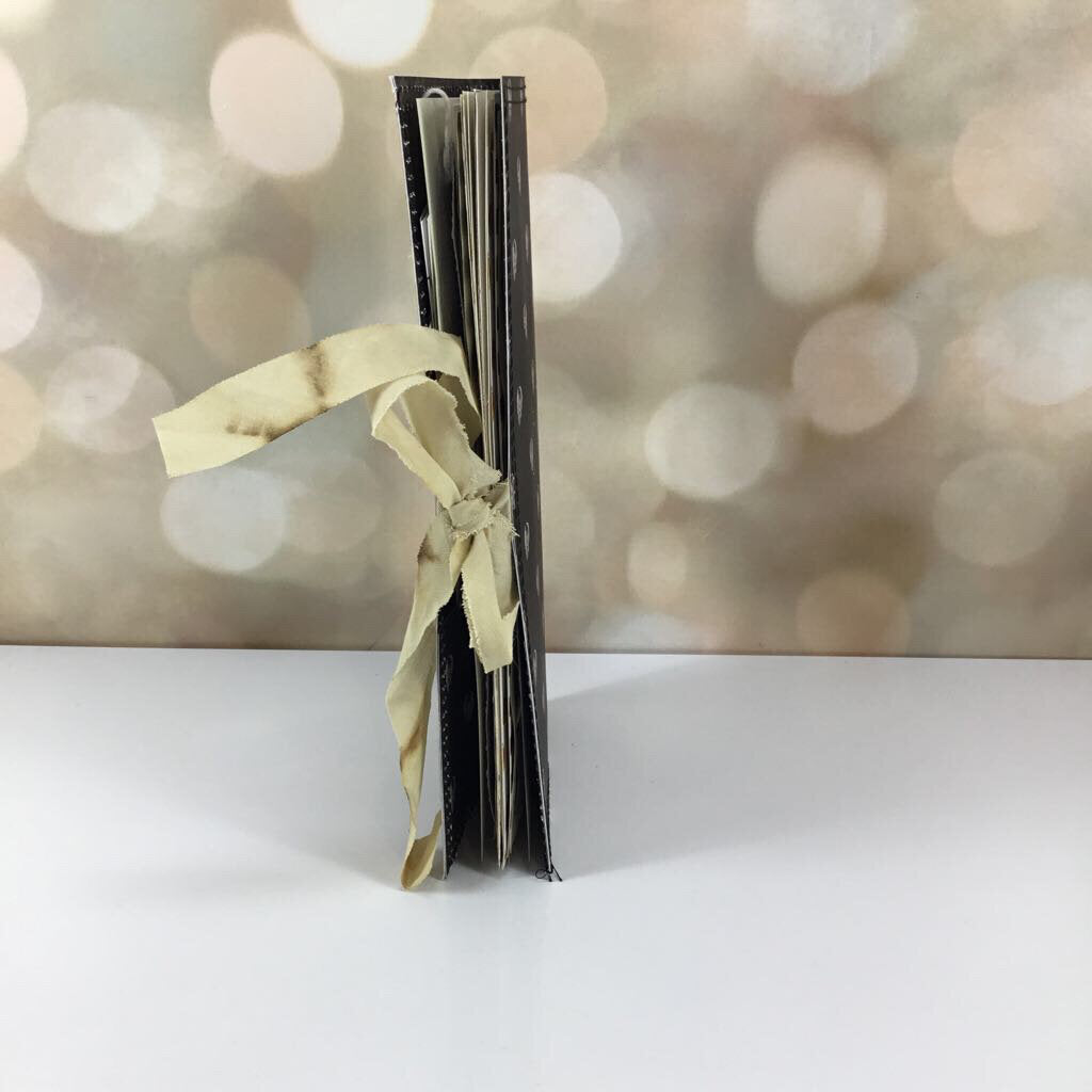 8.5"H x 4.5" W with 56 pages, sewed cardstock cover with attached closure and fabric trim on the spine. Halloween...