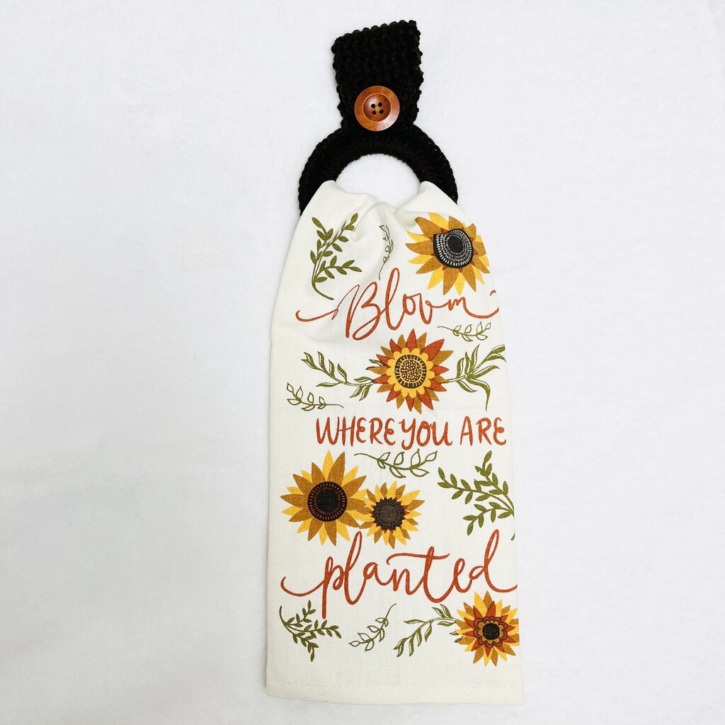 Each hanging towel set consists of a kitchen towel and a crochet towel holder ring.