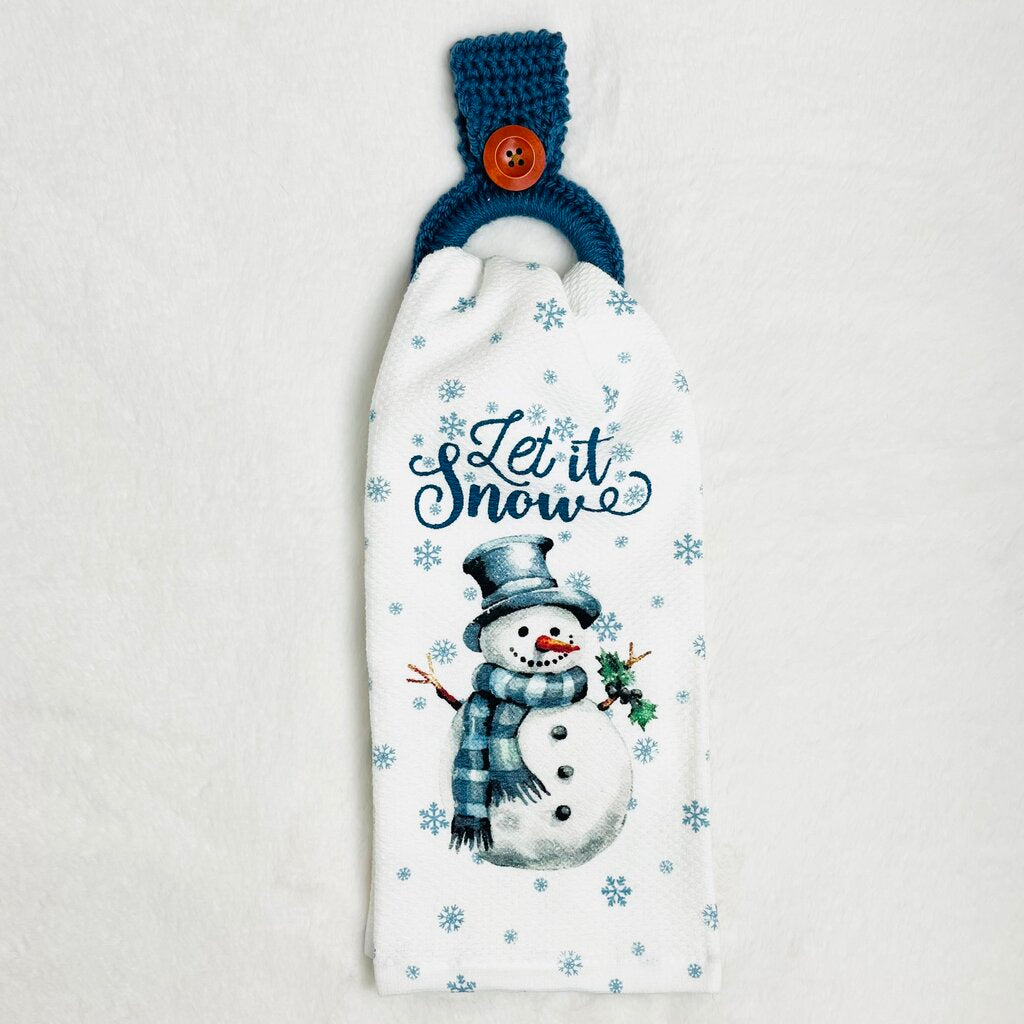 Each hanging towel set consists of a kitchen towel and a crochet towel holder ring.