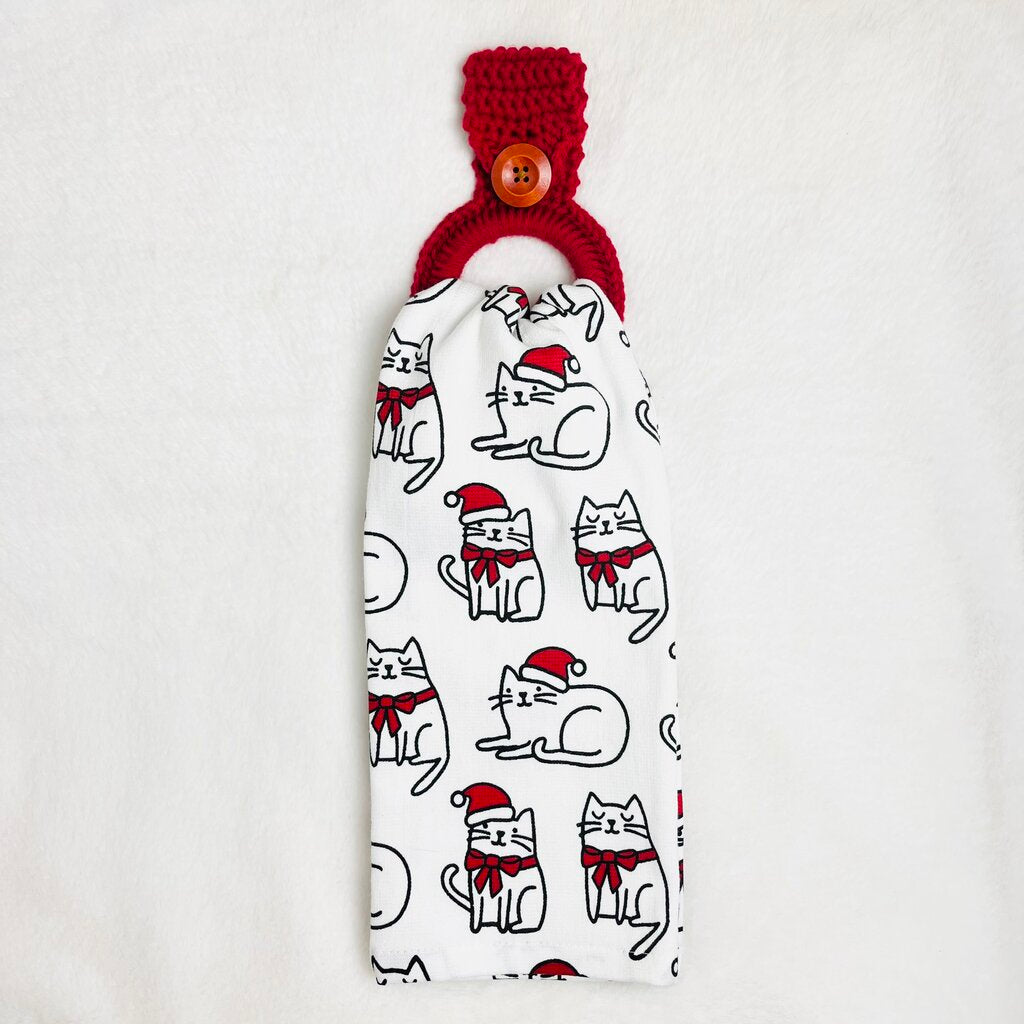 Each hanging towel set consists of a kitchen towel and a crochet towel holder ring.