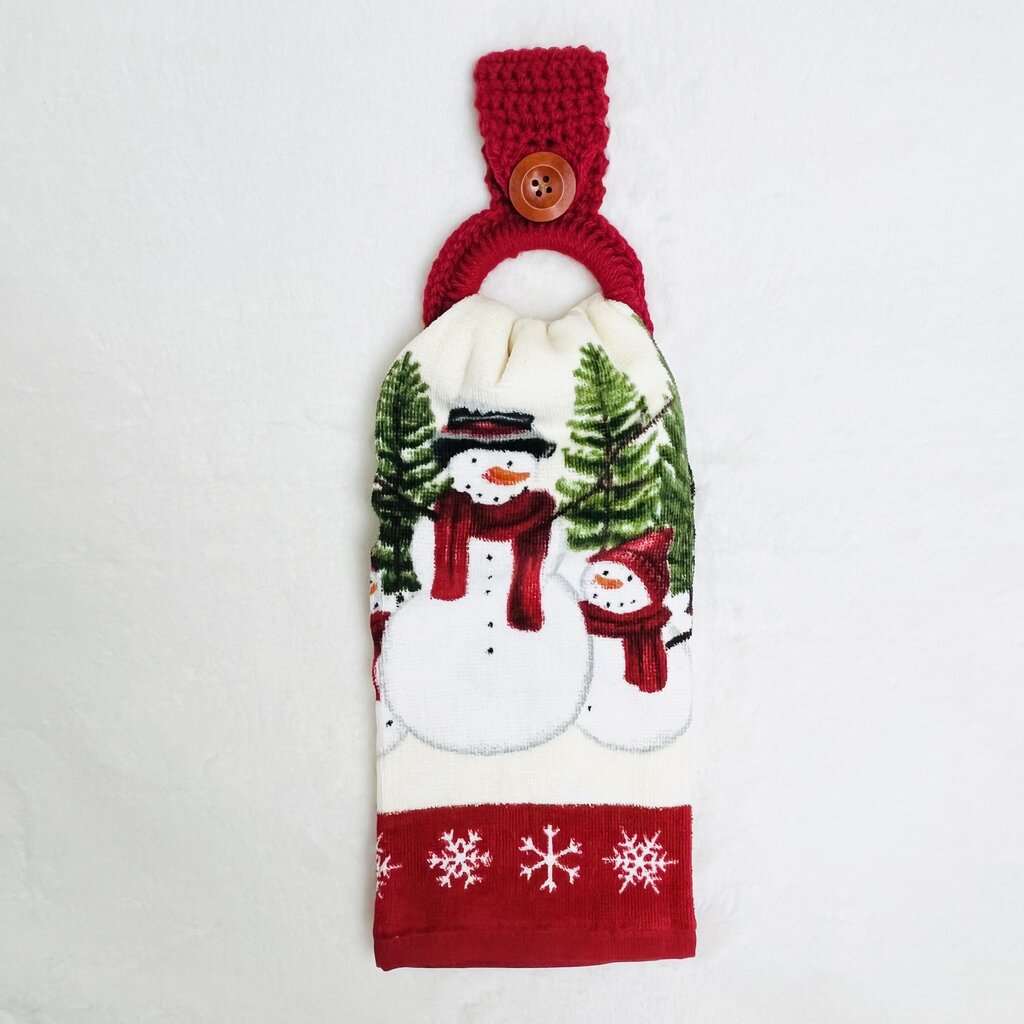 Each hanging towel set consists of a kitchen towel and a crochet towel holder ring.