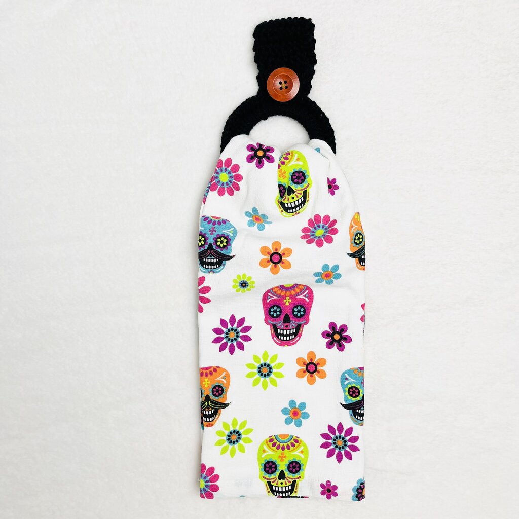 Each hanging towel set consists of a kitchen towel and a crochet towel holder ring.