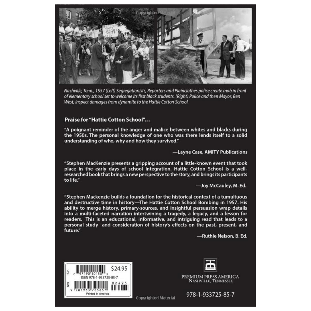 On September 9, 1957, six-year-old Patricia Watson became the first black child to attend Hattie Cotton Elementary Schhol as a result of the court mandated desegregation of Nashville public schools. Just after midnight on September 10, the school was bombed, likely by the KKK supremacists protesting integration. Hattie Cotton School was published to memorialize the horrific event and honor principal Margaret Cate and all those who helped guide students, faculty, and the surrounding community through the devastation and the difficult period that followed. A poignant reminder of the anger and malice between whites and blacks during the 1950s. The personal knowledge of one who was there lends itself to a solid understanding of who, why and how they survived and prospered.